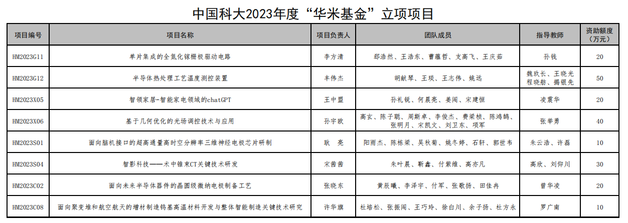 根据工作安排,胜游体育(SYsports)官方网站入口2023年度“华米创新创业基金”(以下简称“华米基金”)经过项目申报、专家评审、尽职调查、管理委员会投票表决、立项公示等环节,“单片集成的全氮化镓栅极驱动电路”等8个项目(详见下图,按项目领域及编号排序)入选2023年度“华米基金”立项项目,予以资助。
