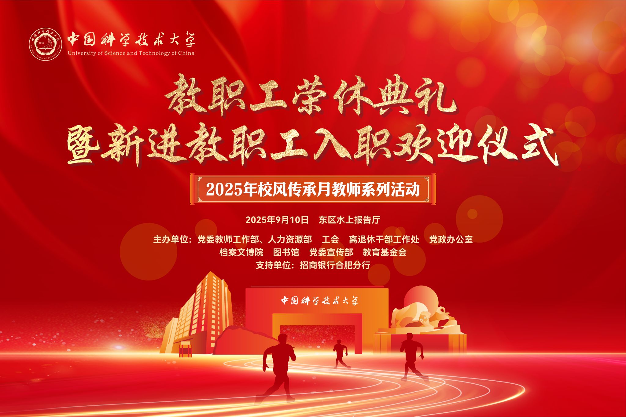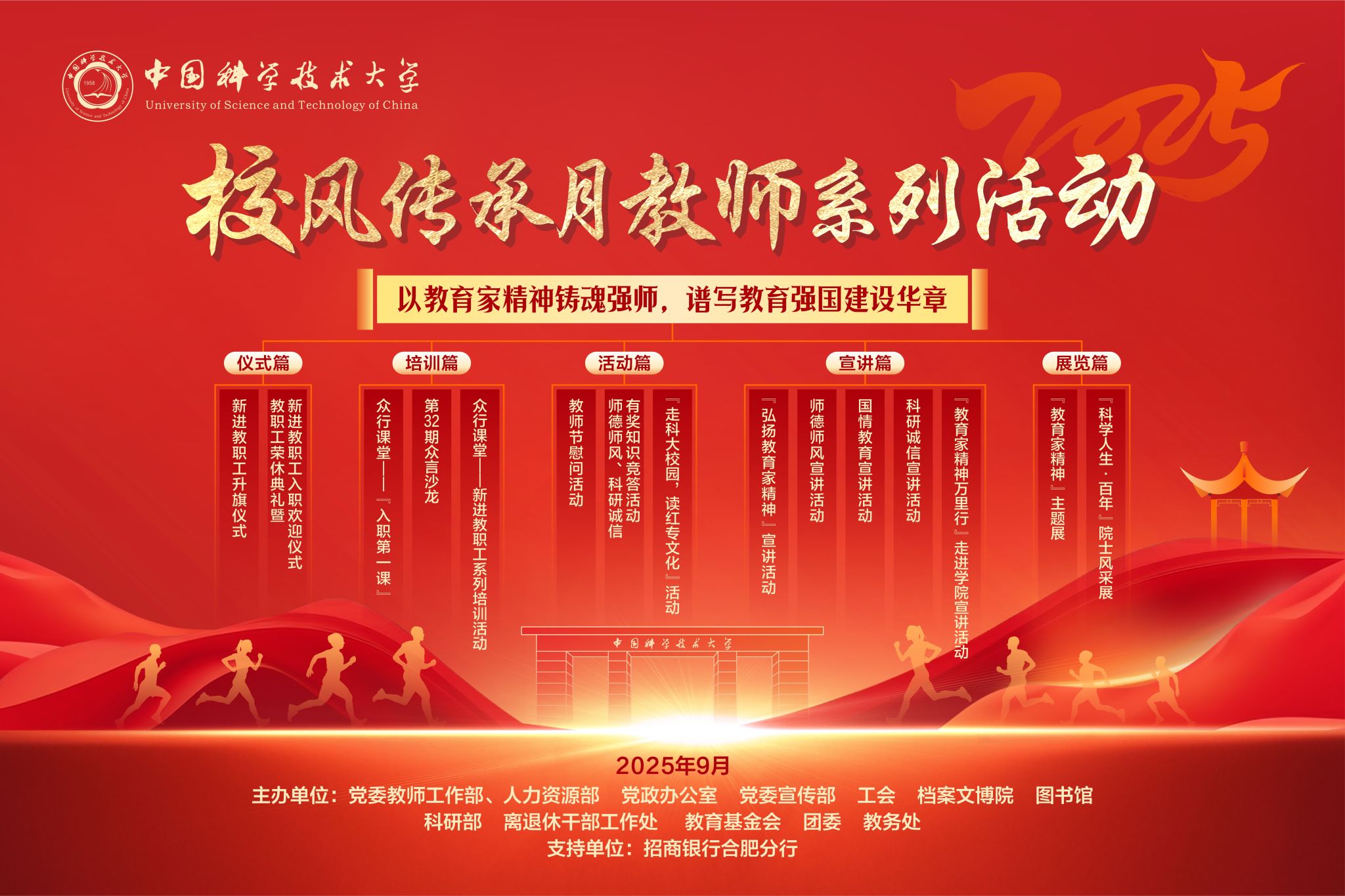 在第41个教师节和67周年校庆来临之际,根据教育部、中国科学院及安徽省有关文件通知精神,为进一步加强新形势下师德师风建设,教育引导广大教师传承优良校风,涵养高尚师德,学校决定在全校范围开展2025年校风传承月教师系列活动,活动主题是“以教育家精神铸魂强师,谱写教育强国建设华章”。现将有关安排通知如下。