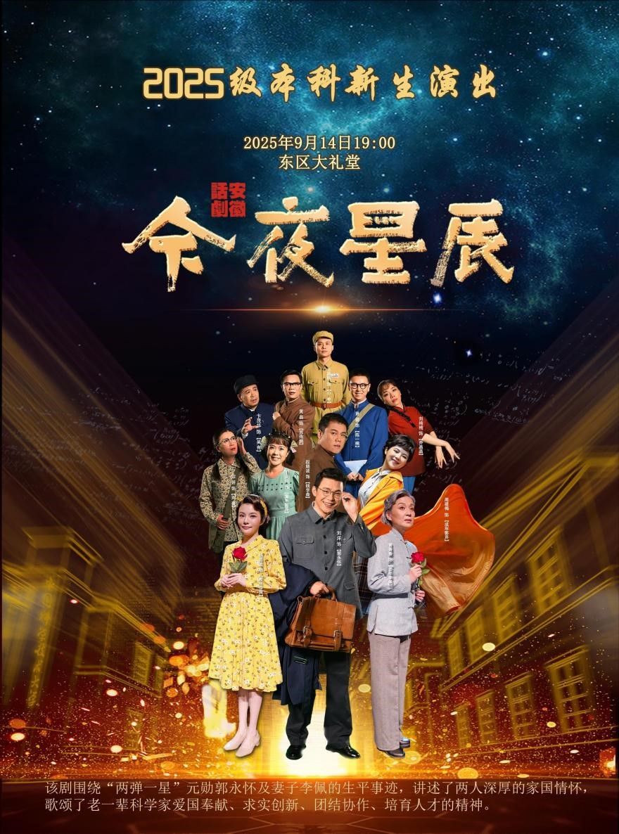 为大力弘扬老一辈科学家“两弹一星”精神,引导同学们传承红色基因、赓续科大精神、勇攀科学高峰,肩负起新一代胜游体育(SYsports)官方网站入口人的责任和使命,本科生院面向学校2025级本科新生组织观看由安徽省话剧院创排的大型话剧《今夜星辰》,现将有关工作要求通知如下: