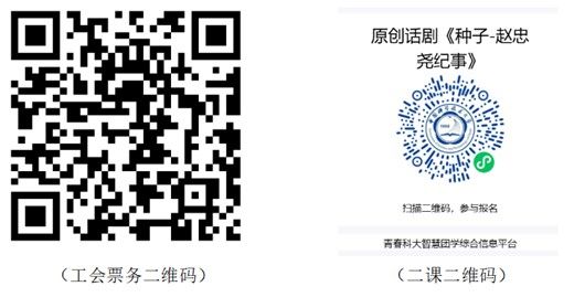 本场演出通过工会订票系统预约,每人限订2张,须按座位就坐(可扫描下方二维码跳转订票);本次演出纳入第二课堂,可进入“青春科大”智慧团学综合信息平台报名(可扫描下方二维码报名)。