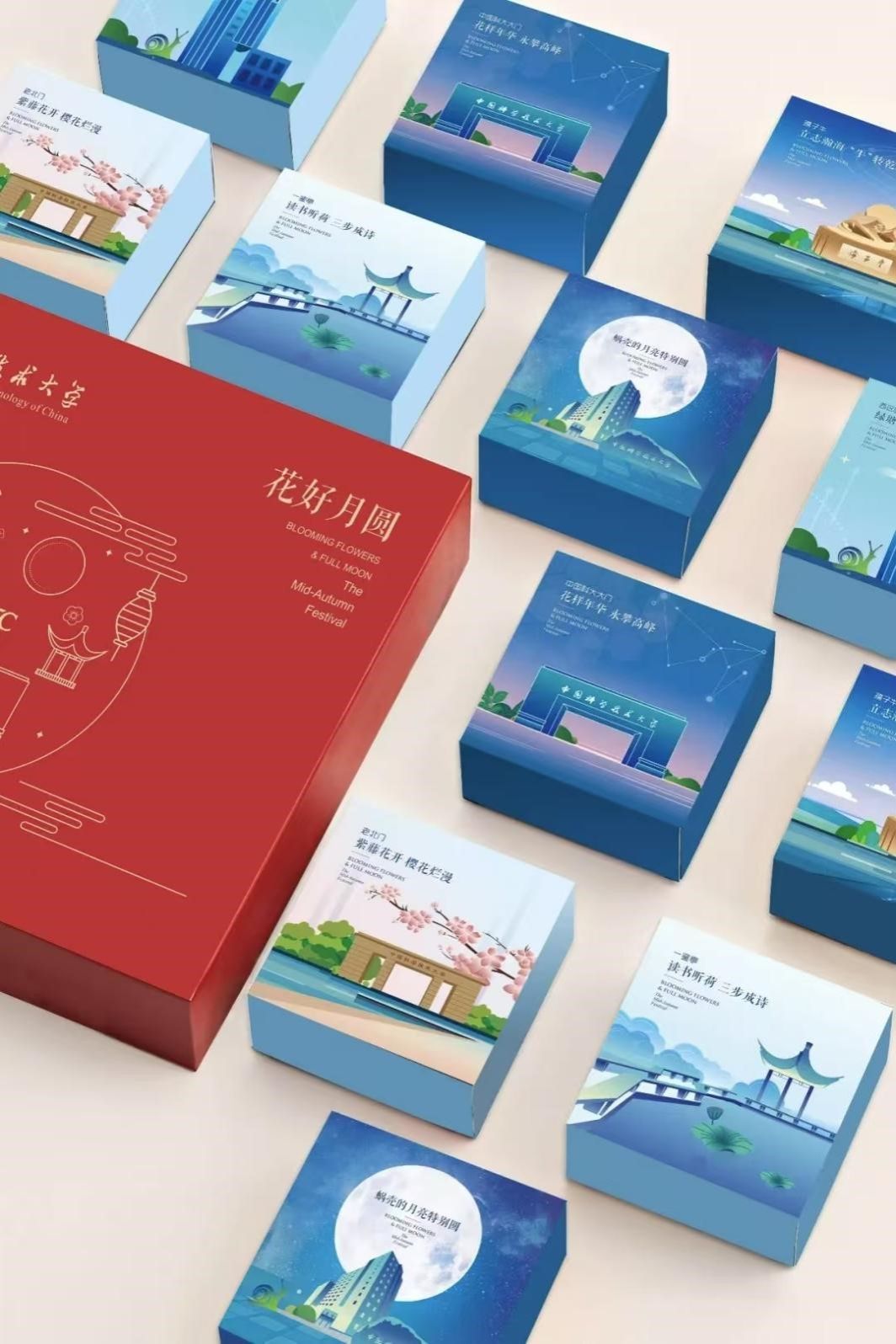 2、视觉设计要求:配色需高级、沉稳,且富有科技感,以体现科大文化,展现出科大人积极进取、乐观向上,勇于担当国家使命、攀登科学高峰的精神风貌。 盒体主要元素可涵盖学校各校区标志性建筑、学科特色主题、校园生活主题,或者根据自身对科大精神的理解和感悟自选主题,进而彰显出科技、理性、厚重、深邃、宽容的文化品格。